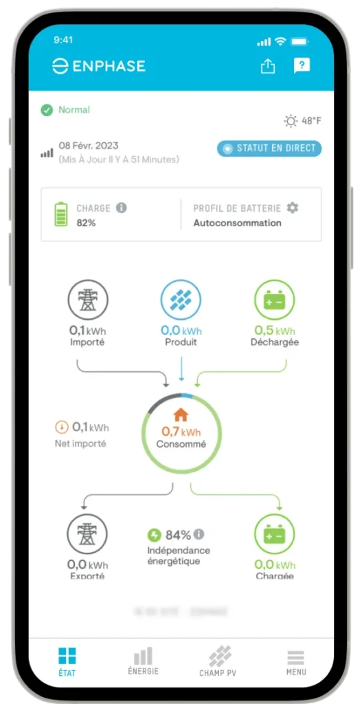 Un suivi régulier de la production d’énergie solaire à travers des applications associées comme notre partenaire Enphase, vous permet d’évaluer la performance de votre installation. Vous pouvez ainsi ajuster l’utilisation de vos appareils domestiques en fonction de la production instantanée d’énergie, maximisant ainsi les bénéfices économiques et écologiques.